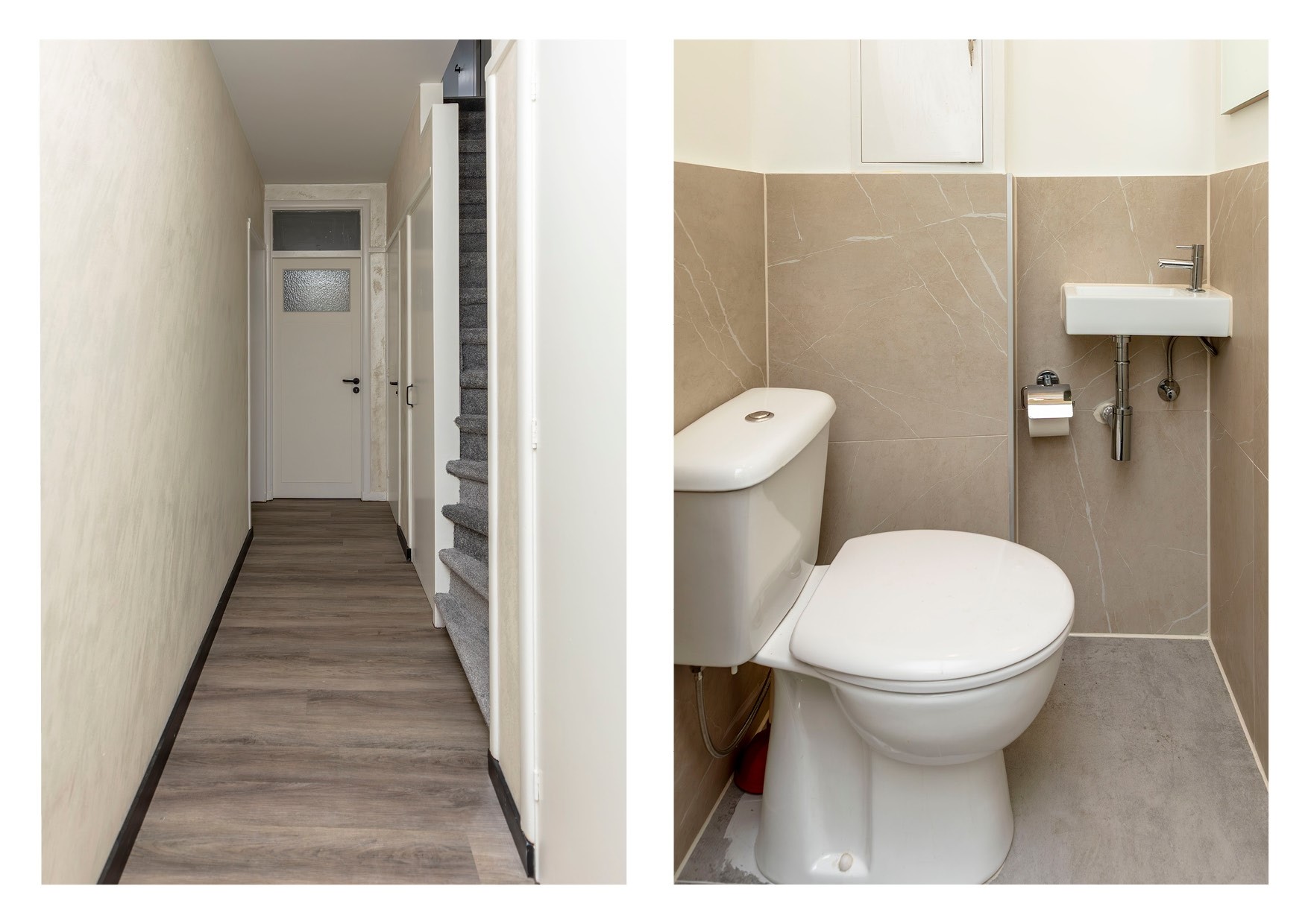Hier kom je binnen in een lange, overzichtelijke hal die toegang geeft tot de wc-ruimte, de badkamer, de woonkamer met open keuken en twee slaapkamers. In de hal bevindt zich ook de trapopgang naar de tweede verdieping waar een extra slaapkamer te vinden is.